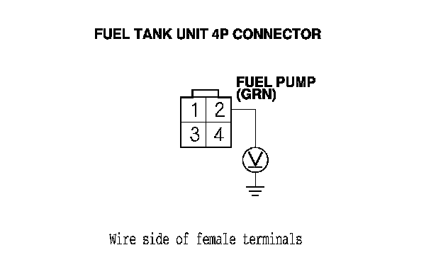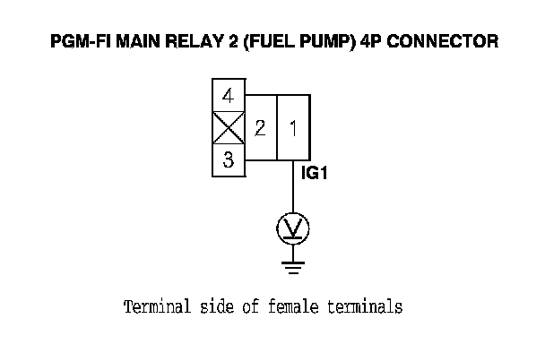 12. Measure the voltage between PGM-FI main relay 2 (FUEL PUMP) 4P connector terminal No. 1 and body ground.