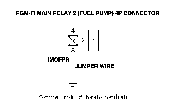 14. Connect PGM-FI main relay 2 (FUEL PUMP) 4P connector terminal No. 3 to body ground with a jumper wire.
