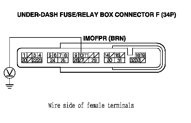 26. Turn the ignition switch to ON (II), and measure the voltage between under-dash fuse/relay box connector F (34P) terminal No. 10 and body ground within 2 seconds.