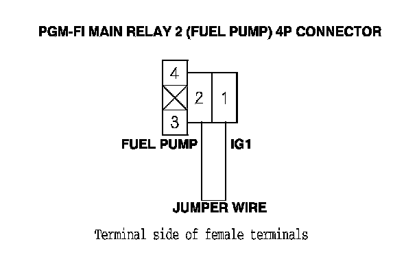 34. Connect PGM-FI main relay 2 (FUEL PUMP) 4P connector terminals No. 1 and No. 2 with a jumper wire.