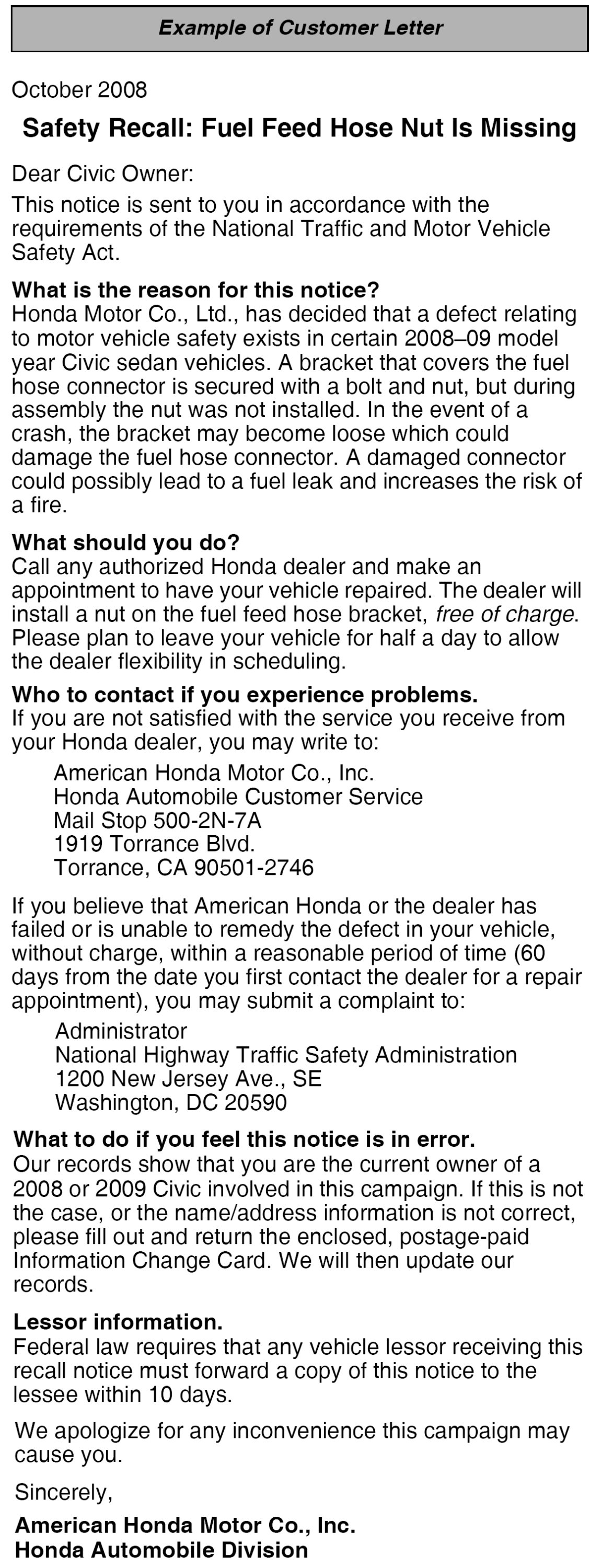 Recall - Fuel Feed Hose Bracket Nut Missing