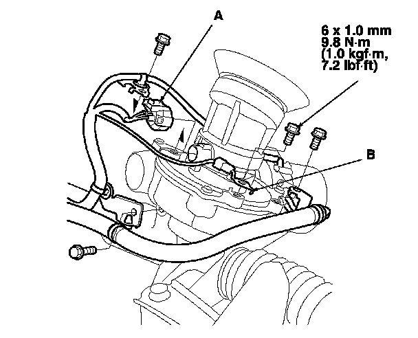 8. Connect the torque sensor 3P connector (A) to the steering gearbox, then install the wire harness clamp bolts and the ground terminal (B).