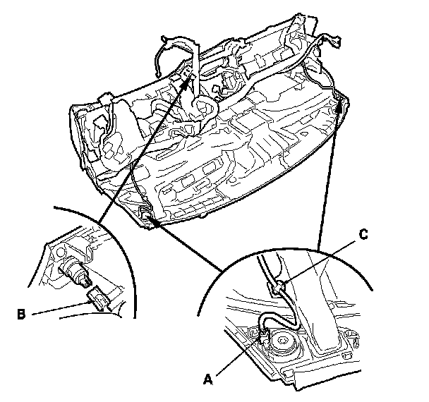 5. From the back of the dashboard, disconnect the tweeter connectors (A) and the accessory socket connector (B), then detach the harness clips (C).