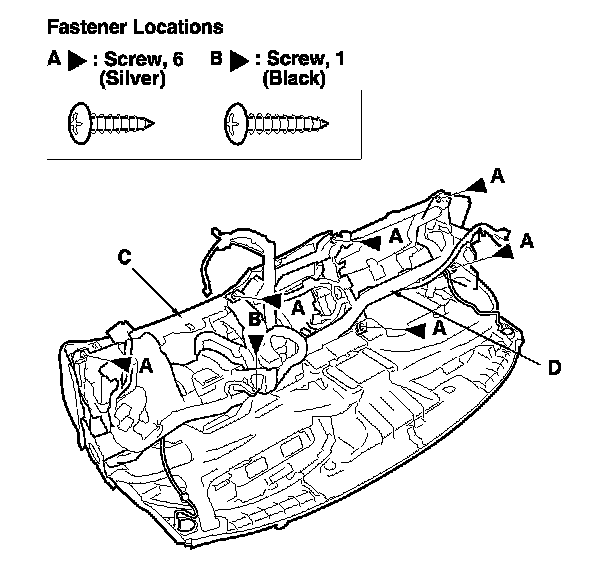 6. From the back of the dashboard, remove the screws (A, B), then separate the dashboard (C) from the steering hanger beam (D).