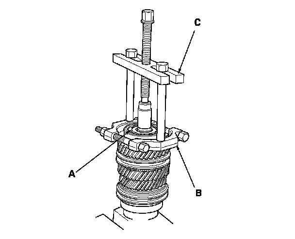 1. Remove the angular ball bearing (A) using a commercially available bearing separator (B) and a commercially available bearing puller (C).