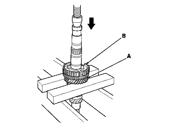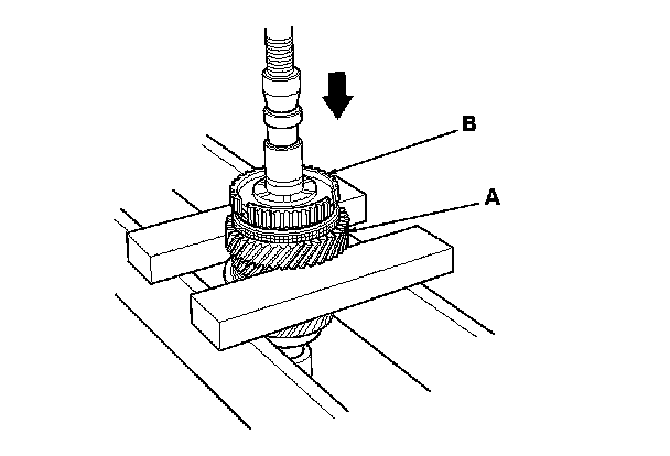 2. Support 5th gear (A) on steel blocks, and press the mainshaft out of the 5th/6th synchro hub (B) and 5th gear.