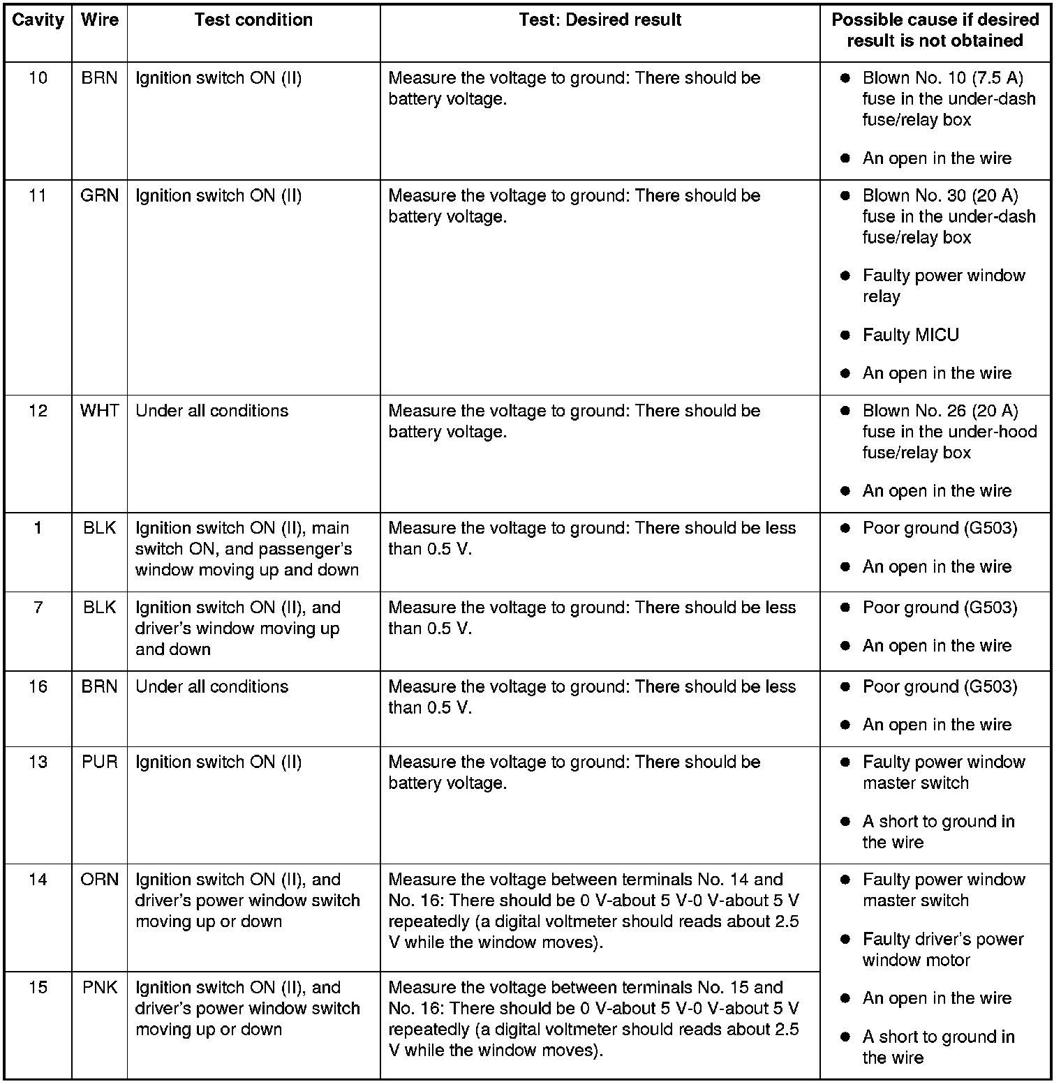 - If all the input tests prove OK, the control unit must be faulty; replace the power window master switch.