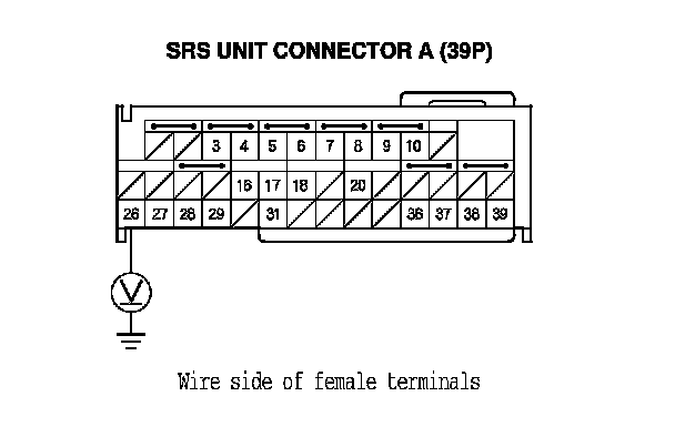 11. Measure the voltage between SRS unit connector A (39P) terminal No. 26 and body ground. There should be battery voltage.