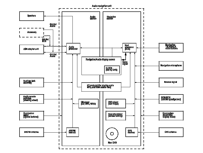 The GA-Net bus passes accessory and USB commands to the navigation unit.