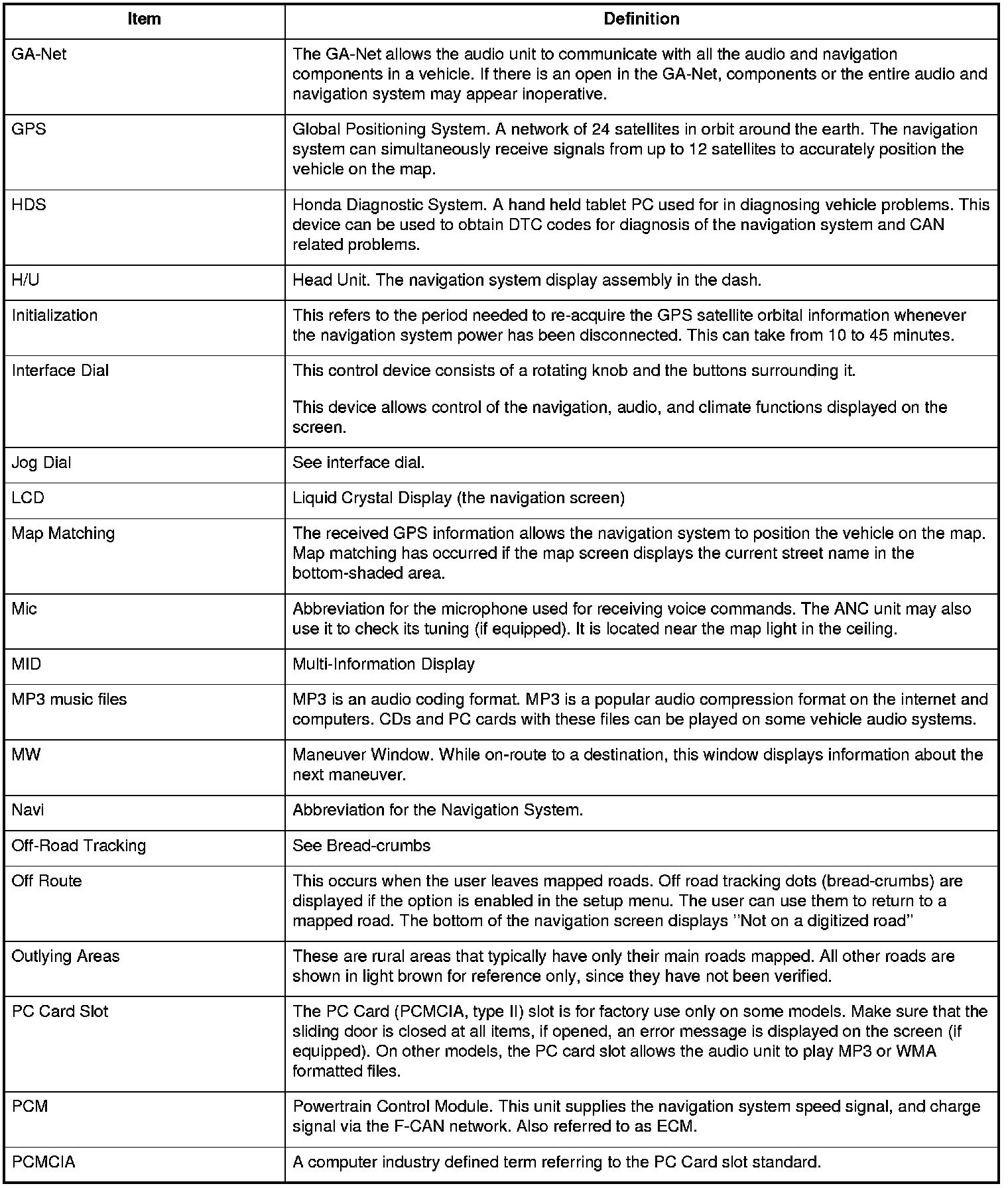 The following is a glossary of terms pertaining to the voice recognition navigation system. All items may not apply to this vehicle. See the navigation system manual for more information.