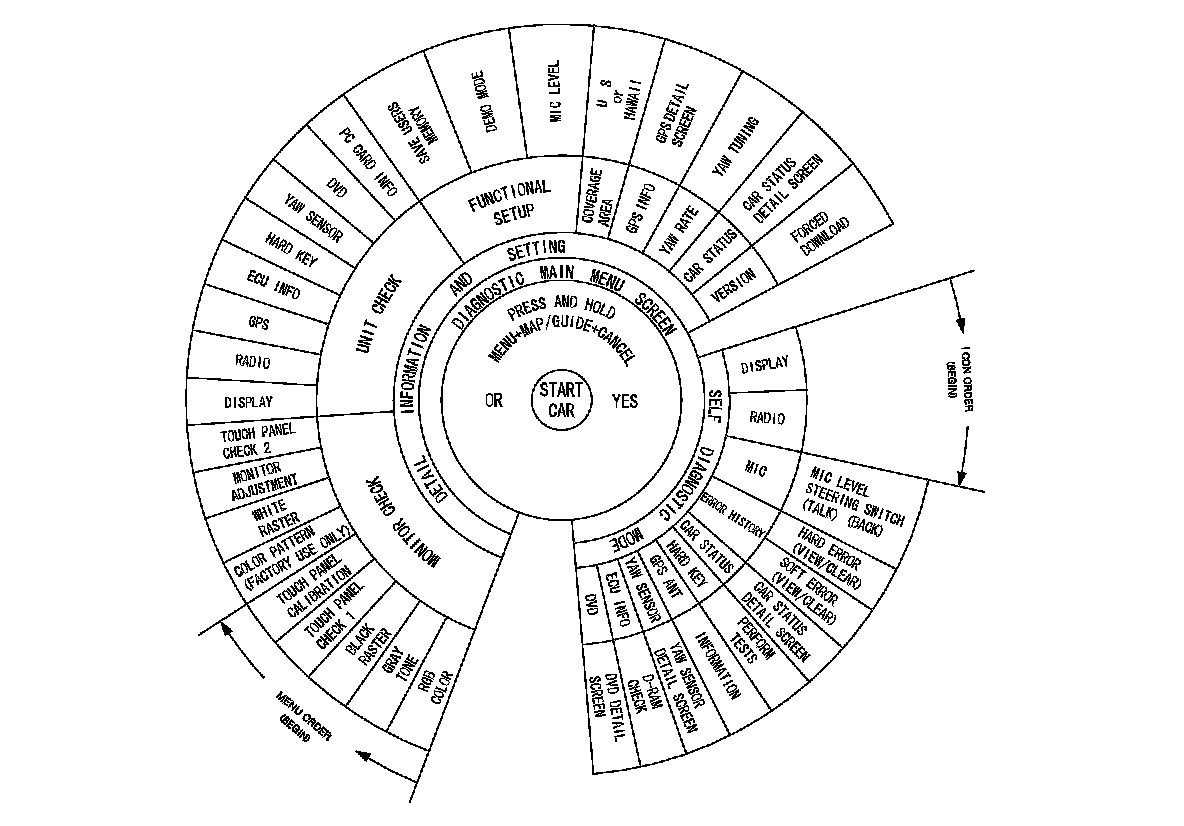 Access to the diagnostic features begins by starting the vehicle. This is necessary so the system can check the other systems connected by various busses. After starting the vehicle you can enter the diagnostic mode either by pressing and holding MENU + MAP/GUIDE + CANCEL.