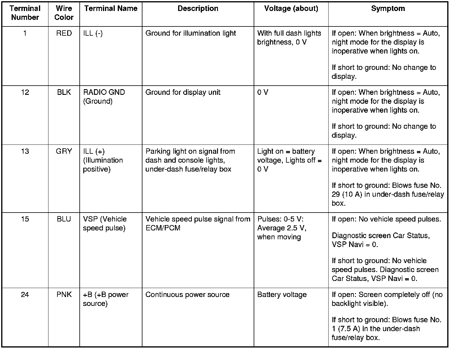 The audio-navigation unit calculates the vehicle position (the driving direction and the current position) by receiving the directional change signals from the yaw rate sensor and the travel distance signals from vehicle speed pulse (VSP) signal of the ECM/PCM.