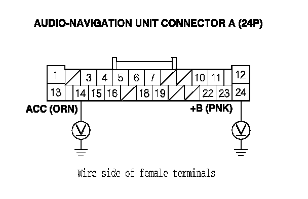 5. Measure the voltage between audio-navigation unit connector A (24P) terminals No. 14 and No. 24 and body ground individually.