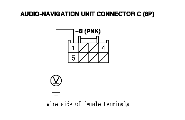 6. Measure the voltage between audio-navigation unit connector C (8P) terminal No. 1 and body ground.