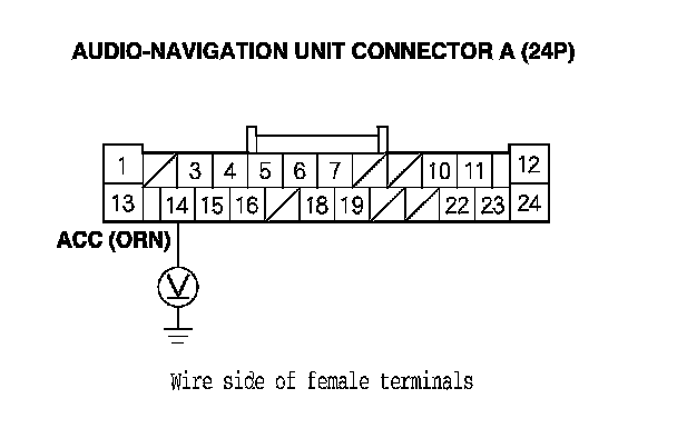 4. Measure the voltage between audio-navigation unit connector A (24P) terminal No. 14 and body ground.