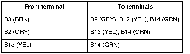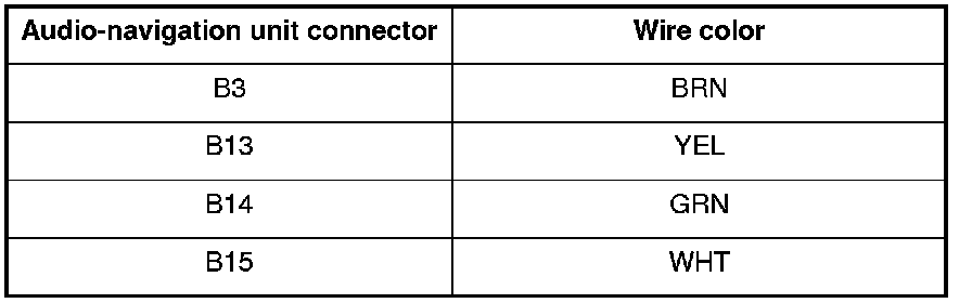 11. Check for continuity between audio-navigation unit connector B (24P) according to the table.