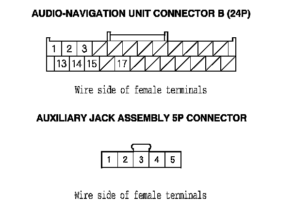 12. Check for continuity between audio-navigation unit connector B (24P) and auxiliary jack assembly 5P connector according to the table.