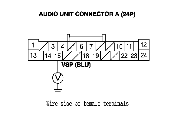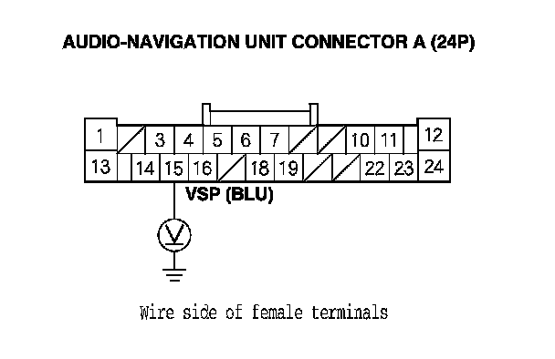 8. Slowly spin one of the front wheels by hand, and have an assistant measure the voltage at navigation or audio unit connector A (24P) terminal No. 15.