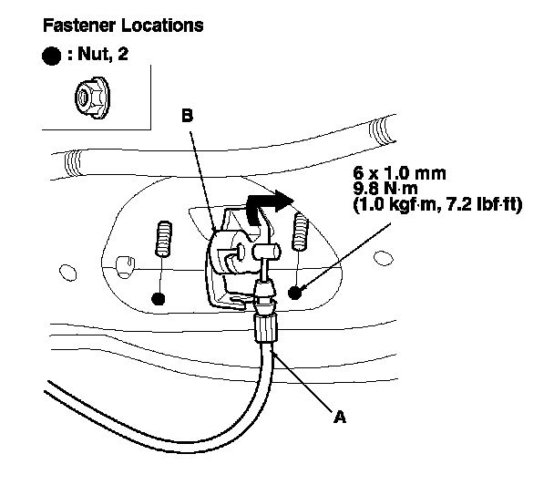 2. Disconnect the tailgate opener cable (A) from the tailgate handle (B), and remove the nuts. Take care not to kink the cable.