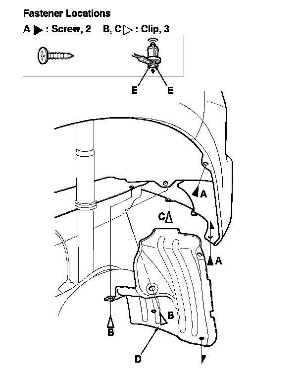 1. Remove the screws (A) and the clips (B, C), then remove the rear inner fender (D).