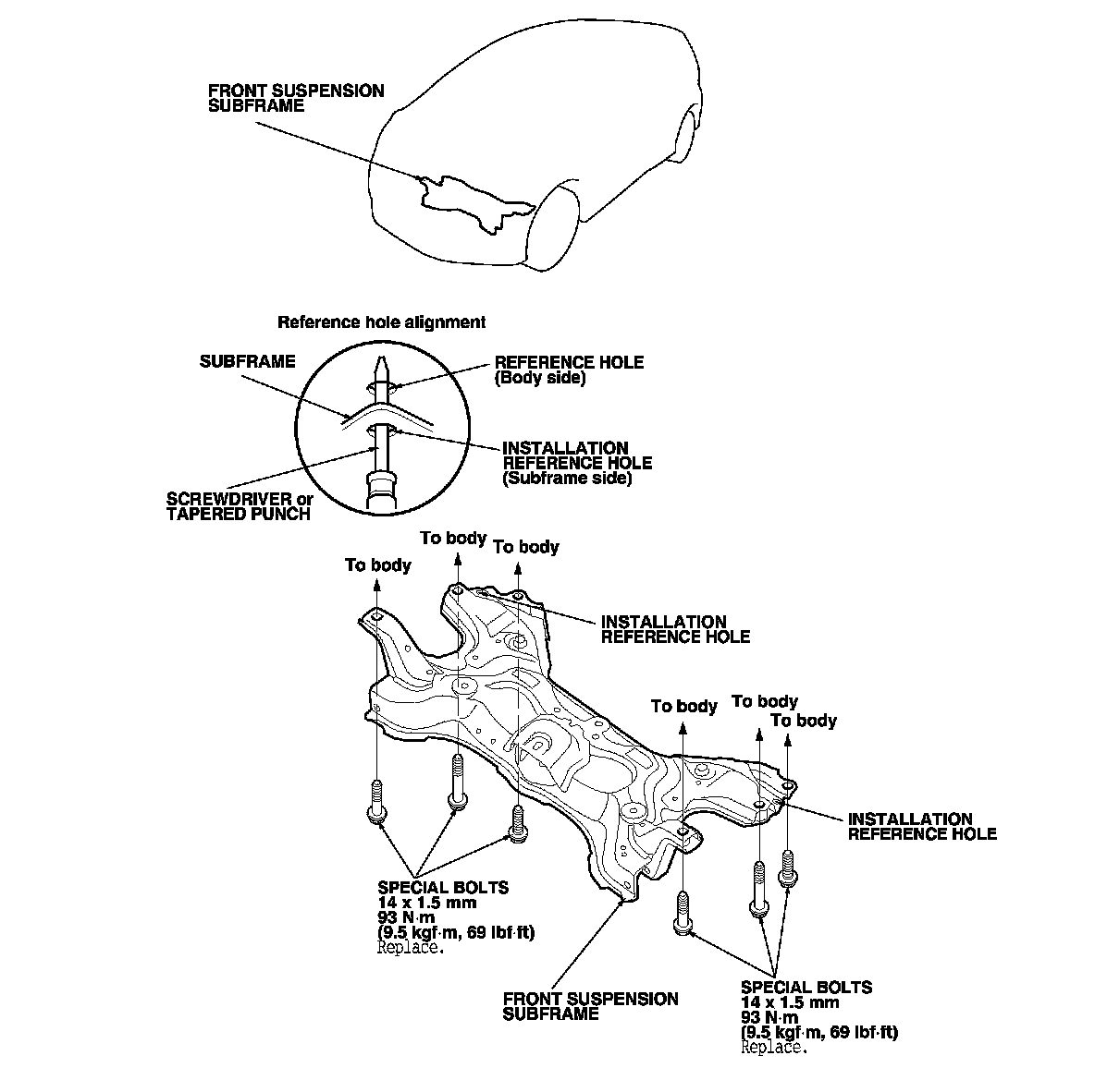 - When installing, align both installation reference holes in the subframe with both reference holes in the body using a screwdriver or tapered punch as a guide.