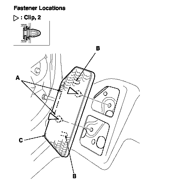 3. Pry up at the gap (A) to detach the clips and the pins (B), then remove the footrest (C).