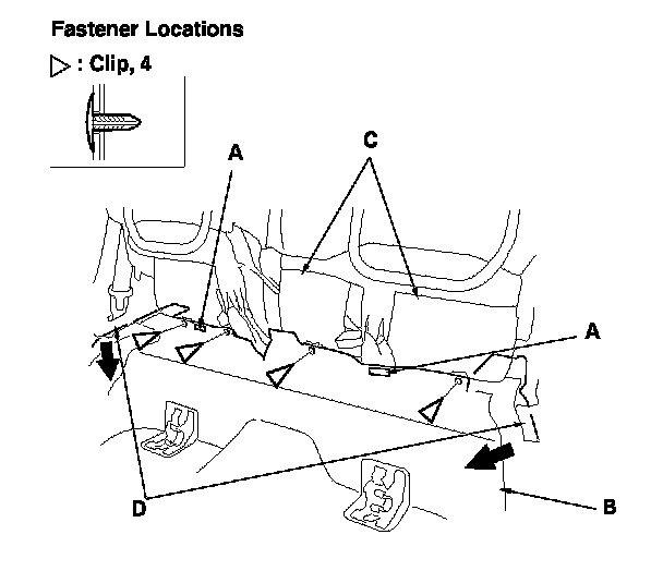 4. Detach the clips and release the Velcro fasteners (A) that fasten the carpet (B) to the bottom of the rear seat-backs (C), then pull the carpet out from under both cargo area side trim panels (D).