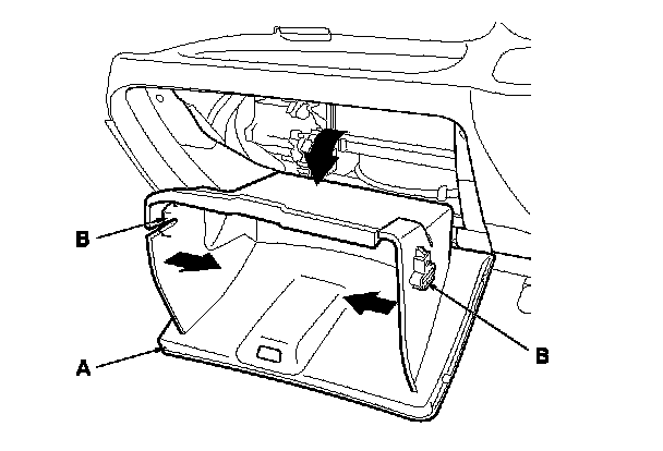 1. While holding the glove box (A), release the glove box stops (B) on each side from the dashboard by pushing them inward, then lower the glove box.
