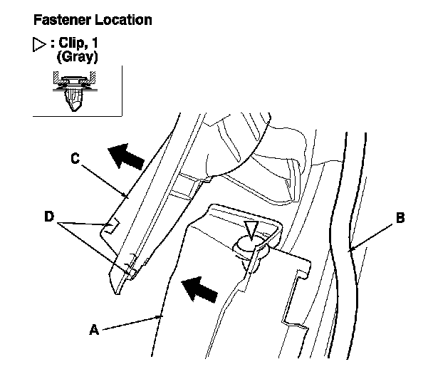 -1 Tip-up the rear seat, and pull out the rear door inner seal (B) as needed, then carefully pull the cargo area side trim panel (C) away from the rear door sill trim by releasing the hooks (D). Pull the upper portion of the rear door sill trim inward to slide it off the clip.