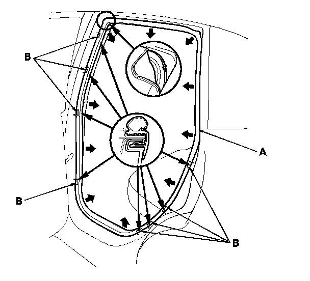 3. Pull out the rear door inner seal (A) from the trim hooks (B) and the rear door opening flange, then remove the seal.