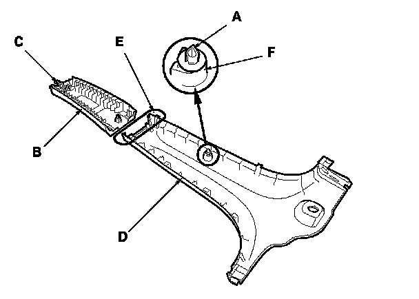 -3 Pull the top of the trim down to release the pin (D) from the body hole, then remove the trim.