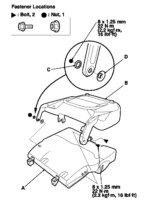 5. Remove the bolts and nut, then separate the rear seat-back (A) and the rear seat cushion (B).
