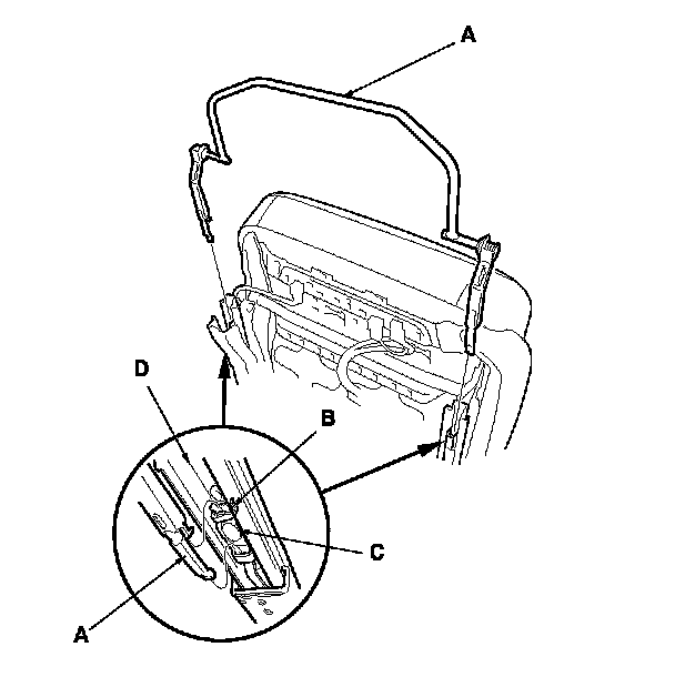 3. From under the seat cushion, lightly tap the slide lever (A) out to disconnect both ends of it from the springs (B) of the slide locks (C) in both seat tracks (D).