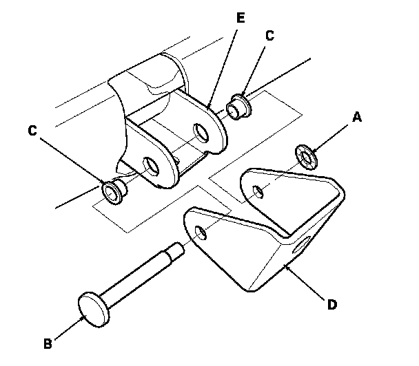 3. Remove the pivot pin, the pivot collars (C), and the hinge (D) from the seat-back frame (E). An inside hinge of a seat-back frame is shown. The outside hinges are symmetrical.