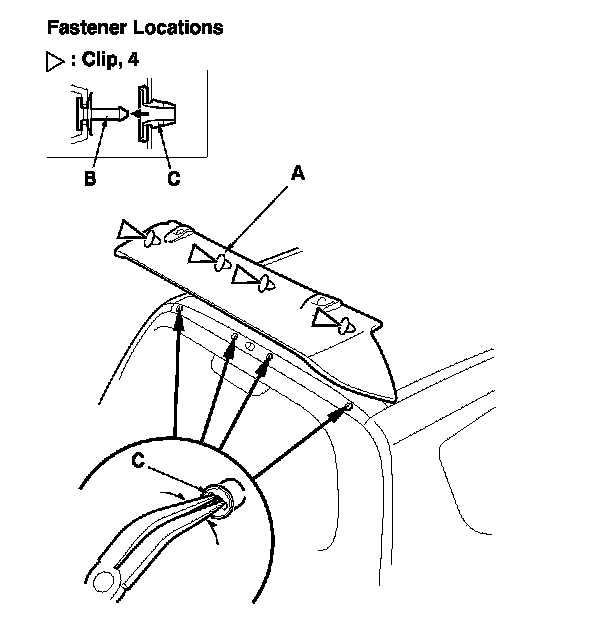 3. Lift up on the tailgate spoiler (A) to detach the pins (B) of the clips from the grommets (C), then remove the spoiler.