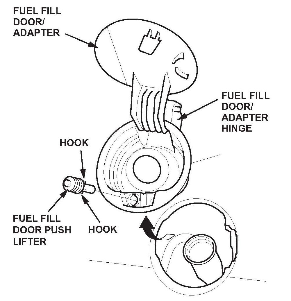 6. Install the new push lifter, then reinstall the fuel fill door/adapter and the fuel fill cap.