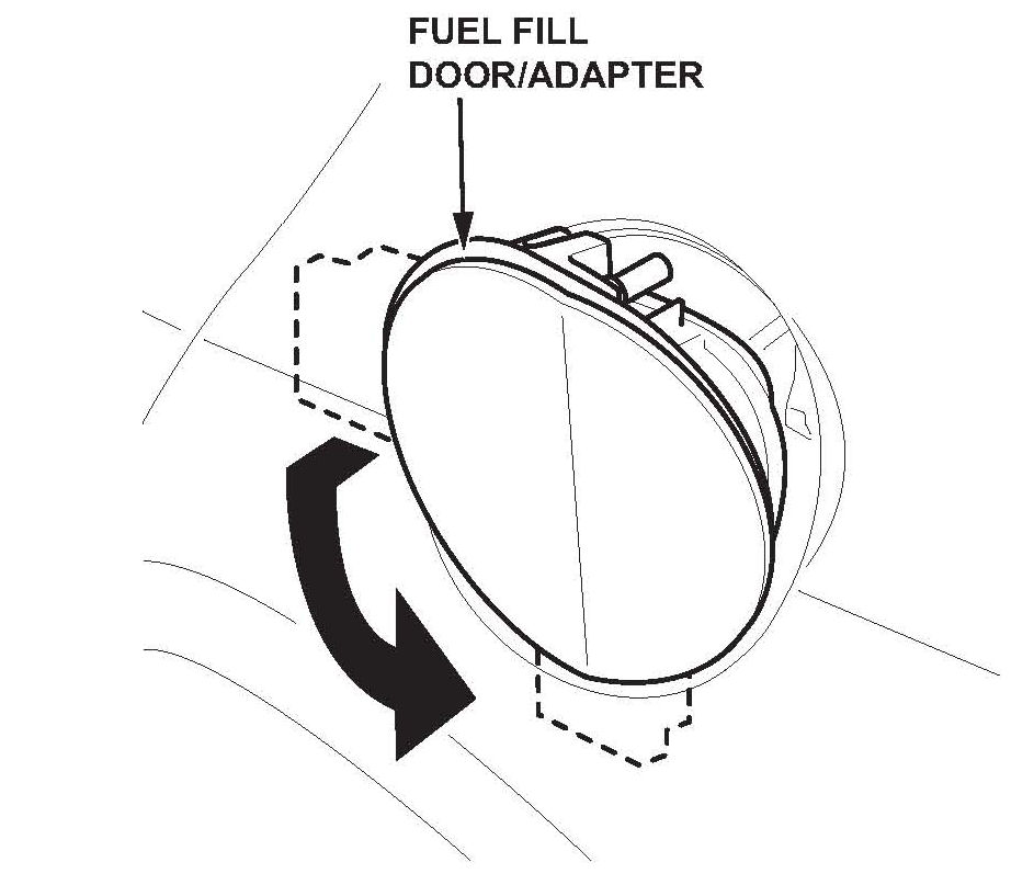 3. With the fuel fill door partially open, pull out the upper half of the fuel fill door/adapter and turn it 90 degrees counterclockwise. Remove the fuel fill door/adapter.
