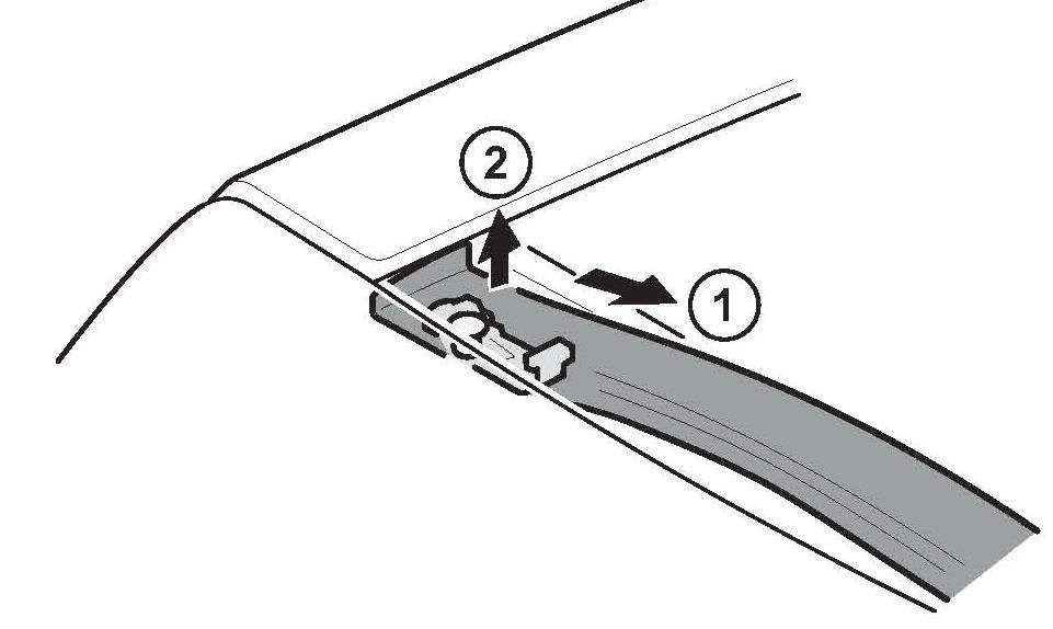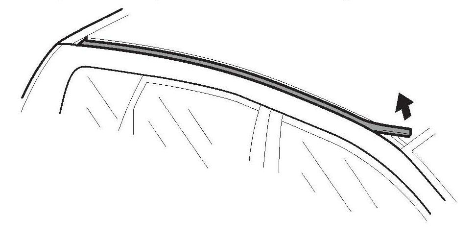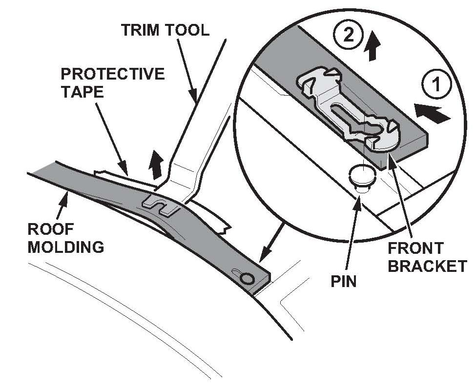 2. Using the appropriate trim tool, pull up and slide the roof molding rearward to release the front bracket from the pin on the body.