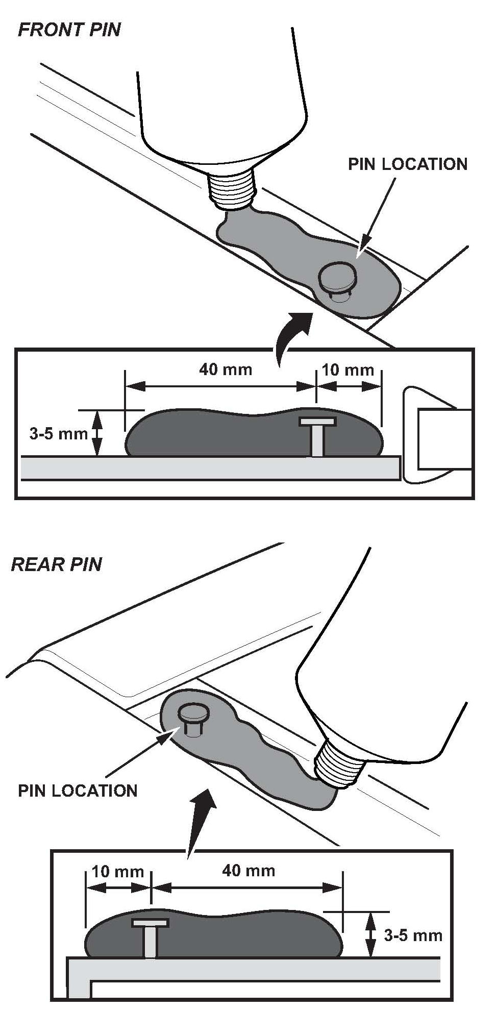 8. Apply a 50 mm bead of Konishi Bond to the front and rear pins as shown until the pins on the body are completely covered.