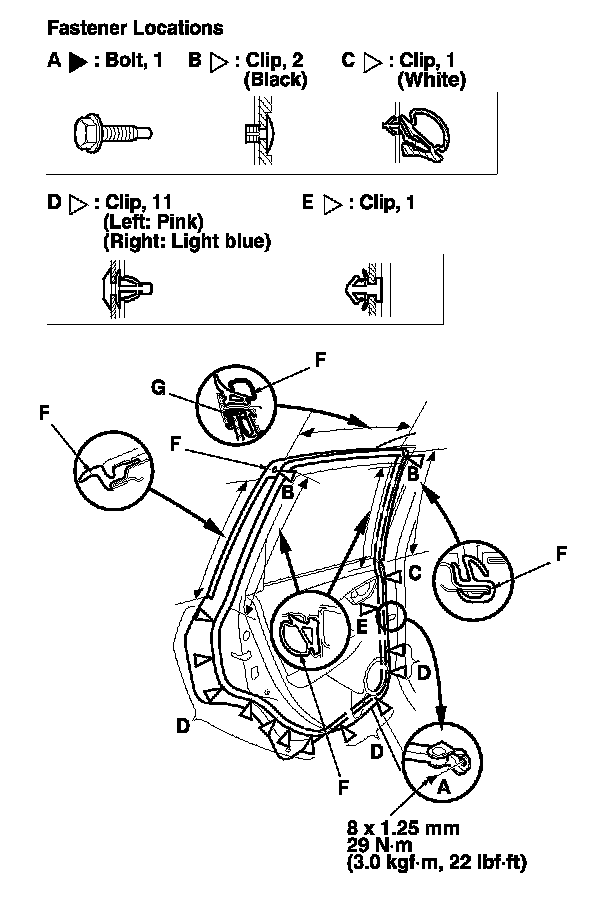 3. Detach the clips (B, C, D, E), then remove the door weatherstrip (F).