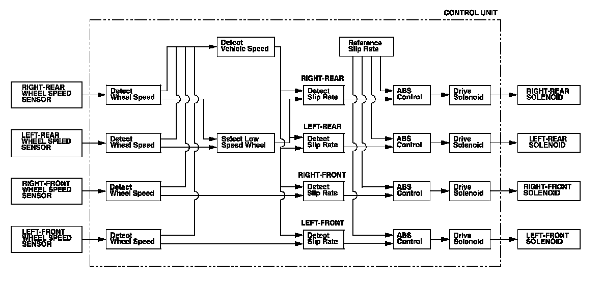 Without ABS, when the brake pedal is pressed while driving, the wheels sometimes lock before the vehicle comes to a stop. In such an event, the maneuverability of the vehicle is reduced if the front wheels are locked, and the stability of the vehicle is reduced if the rear wheels are locked, creating an extremely unstable condition. With ABS, the system precisely controls the slip rate of the wheels to ensure maximum grip force from the tires, and it thereby ensures maneuverability and stability of the vehicle. The ABS calculates the slip rate of the wheels based on the four wheel speeds, and then it controls the brake fluid pressure to reach the target slip rate.