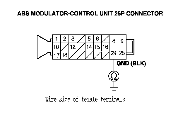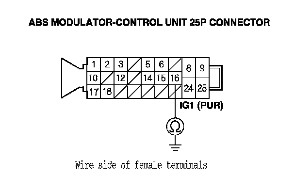 4. Check for continuity between ABS modulator-control unit 25P connector terminal No. 16 and body ground.