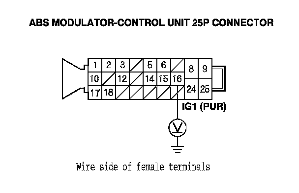 10. Measure the voltage between ABS modulator-control unit 25P connector terminal No. 16 and body ground.