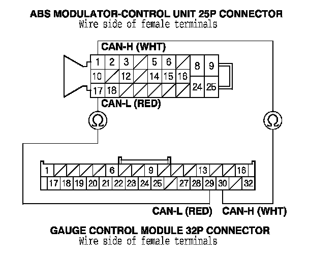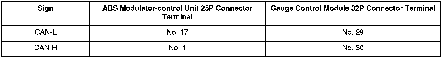 14. Check for continuity between the ABS modulator-control unit 25P connector terminal and gauge control module 32P connector terminal (see table).