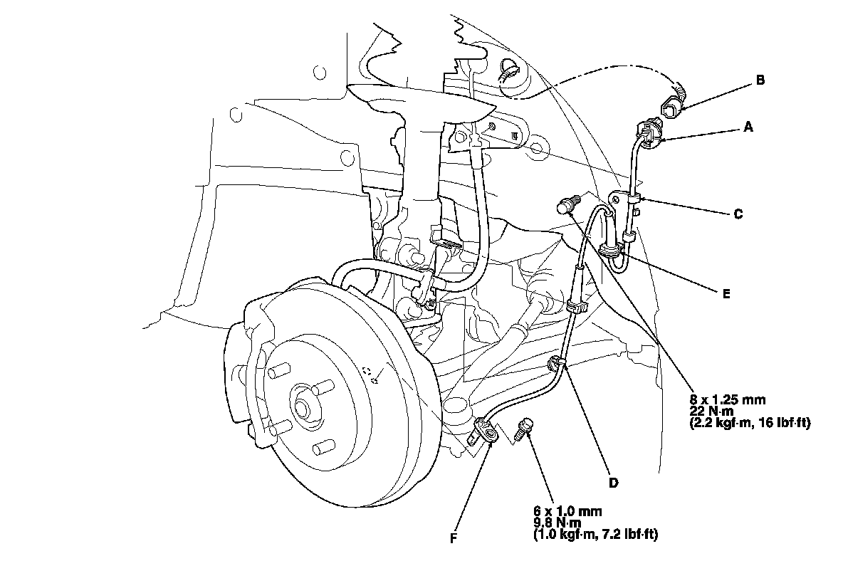4. Remove the bolt and the wheel speed sensor (F).