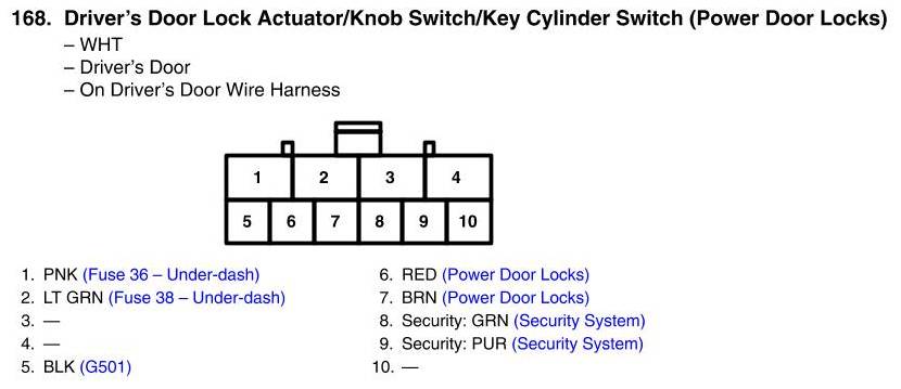 View 168 - Driver's Door Lock Actuator/Knob Switch/Key Cylinder Switch Connector View (Power Door Locks)