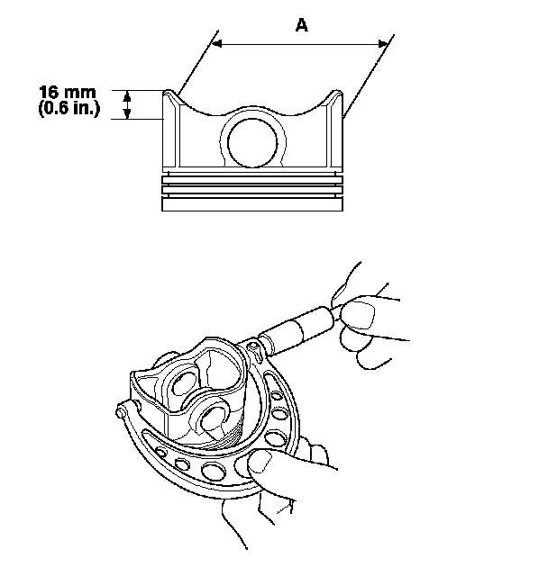 3. Measure the piston diameter (A) at a point 16 mm (0.6 in.) from the bottom of the skirt.