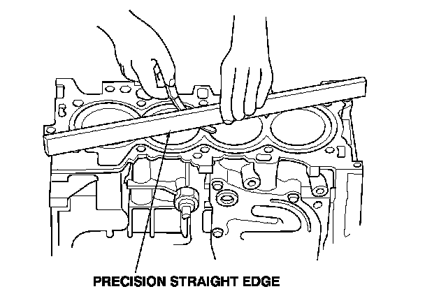 6. Check the top of the engine block for warpage. Measure along the edges and across the center as shown.