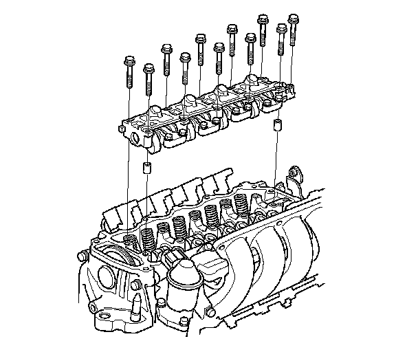 3. Unscrew the rocker shaft mounting bolts two turns at a time in sequence shown.
