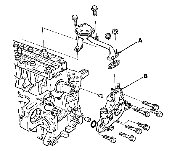 6. Remove the oil screen (A), then remove the oil pump (B).